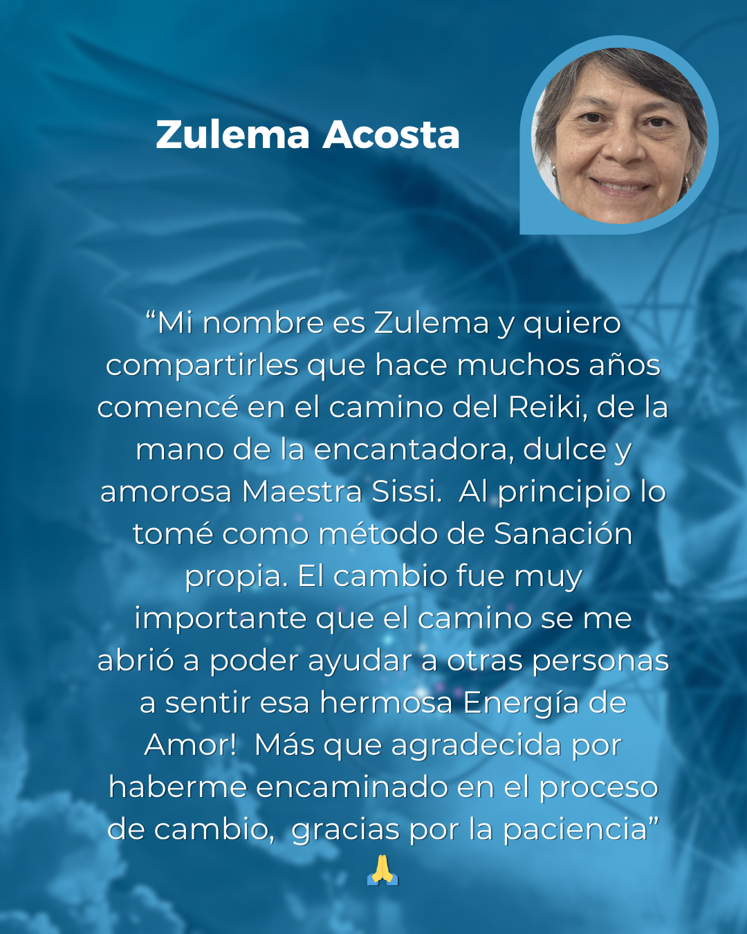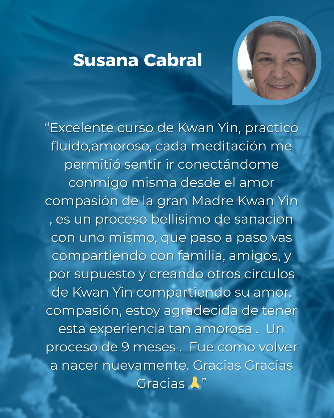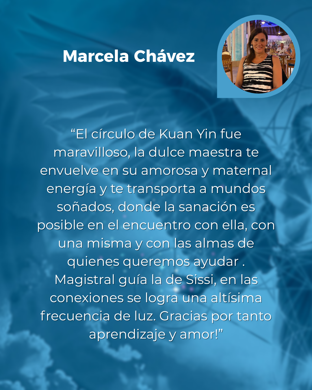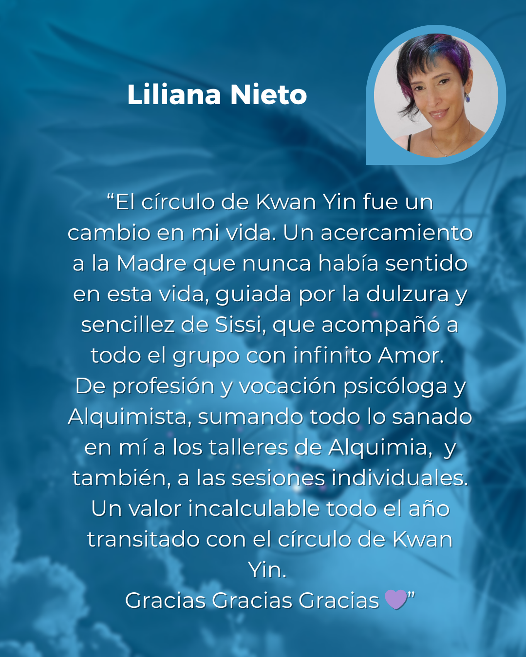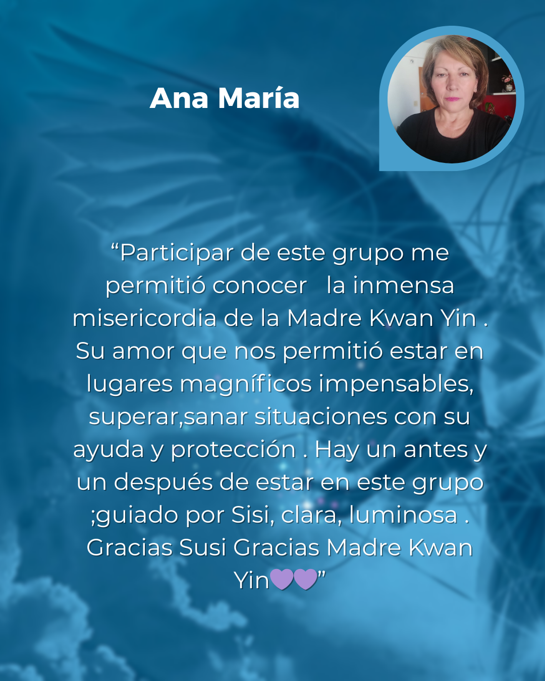 “Agradezco haber participado en el circulo de Kwan Yin. ............ A la Madre Kwan Yin ,que nos acompaño con su belleza , dulzura , amor , y nos traslado a espacios,dónde el infinito se une con lo posible . Agradezco a todos los Maestros Ascendidos Arcangeles- Arcangelinas ,que permitieron que está energía sanadora permaneciera como manto protector. Y agradezco a Sissy, " amiga, hermana del alma" ,quien maravillosamente, sabiamente , entrelaza estos hilos sutiles de conexión con la fuente de Amor Universal 🙏🙏🙏mil gracias”