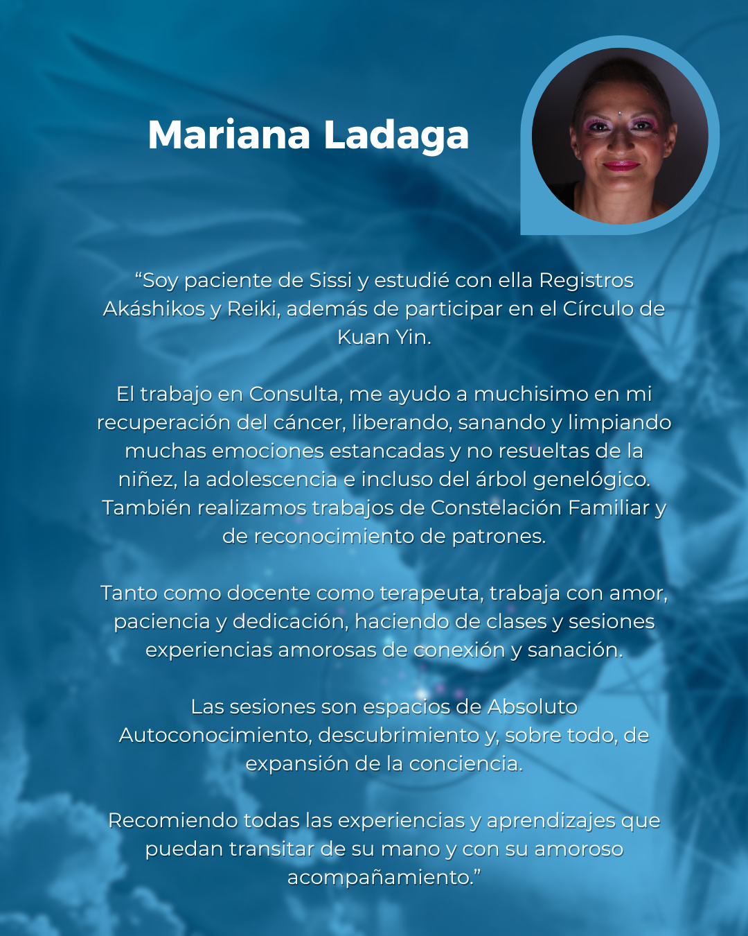 “La conocí a Sissi en su rol de terapeuta, y desde la primera sesión, sentí un cambio tan transformador que empecé a verla mensualmente, Me pareció una herramienta tan valiosa, tan profunda y tan precisa —por momentos hasta mágica— que sentí la necesidad de estudiarla para poder acompañar así a otros. No es sólo ‘abrir Registros’ y canalizar mensajes. Es un proceso integrador, profundo, que une gran variedad de herramientas y terapias dentro del campo akáshico que te llevan a ver la raíz de tus problemas, y a liberarlas completamente.