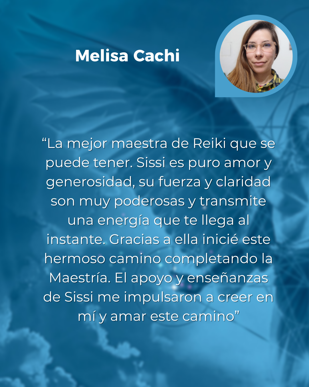 “Comencé el camino del Reiki de la mano de Sissi, y fue una experiencia tan hermosa y amorosa. Fue hermoso porque cuando estaba en el proceso de aprendizaje estaba embarazada y fue algo tan tan hermoso que no se describe. El acompañamiento y el amor de Sissi hizo que me anime a ir por más y asi llegué a los Registros Akáshicos, un viaje tan tan hermoso y amoroso. Es tan alucinante todo lo que se siente y todo lo que pasa que no hay palabras. Quiero agradecer a Sissi por recorrer este camino conmigo acompañando con tanto amor.”
