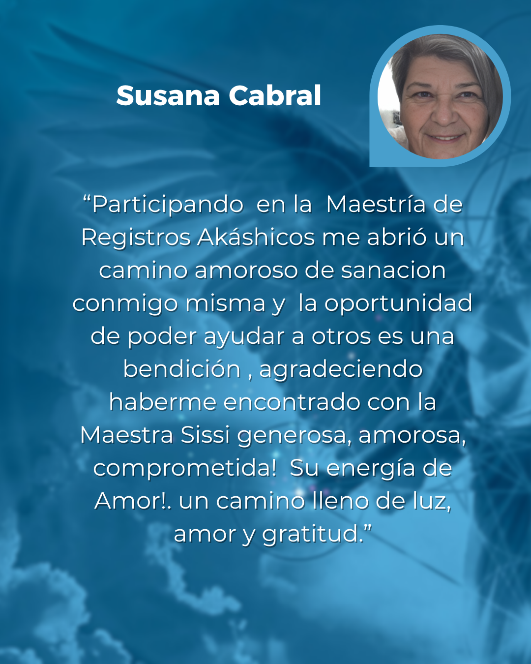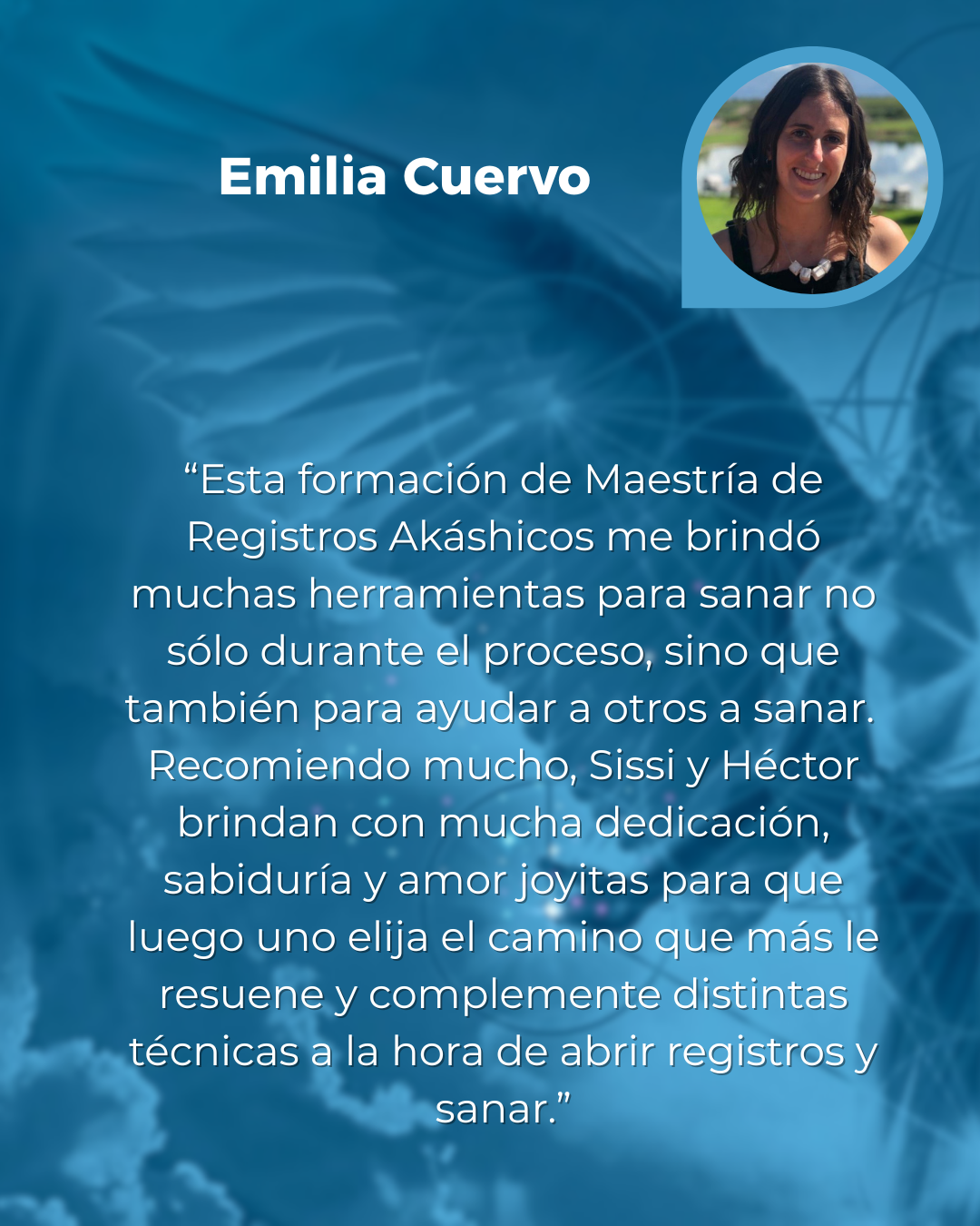 "Me acerqué a los Registros Akáshicos buscando sanar y descubrir cosas en mí, nada más. El camino que se me abrió fue el de poder ayudar y acompañar a otros en ese mismo proceso." "Agradezco para siempre, a los que animaron a ir ese pasito más allá, y a mí mismo por haberme atrevido. En cuanto a la Maestra Sissi, es cercana, amorosa, paciente. Enseguida barre con ese temor reverencial que nos puede generar alguien con su trayectoria y capacidades antes de conocerla."